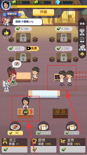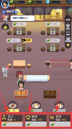 1、進入游戲餐廳經(jīng)營界面,查看底部員工、廚師、宣傳功能區(qū),依據(jù)當前經(jīng)營需求,點擊模塊升級,增加員工數(shù)量,助力餐廳運營。