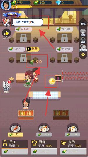 2、員工增加后關(guān)注上方任務進度,等待顧客進入餐廳,當顧客就座消費后獲取金幣獎勵,同時點擊界面中出現(xiàn)的獎勵圖標,領(lǐng)取獎勵,積累金幣資源。