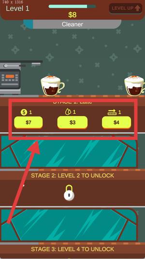 2、在STAGE1場景,看到制作咖啡的資源選項(xiàng),點(diǎn)擊資源按鈕,投入資源進(jìn)行咖啡制作流程,完成制作后獲取金幣收益,積累資金。