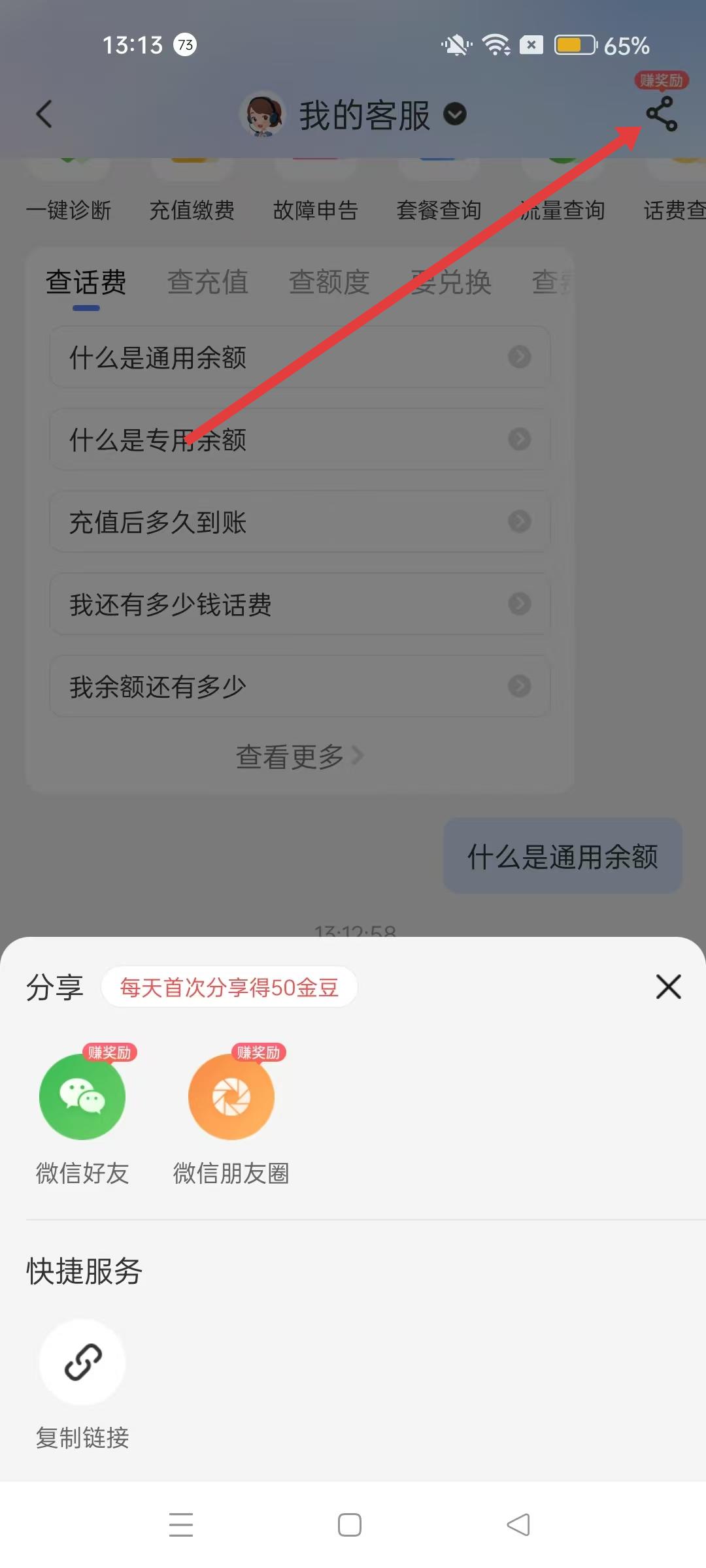 3、客服解答頁面點擊分享按鈕,可選擇分享給微信好友、微信朋友圈或復制鏈接,方便將客服解答內容分享給他人。