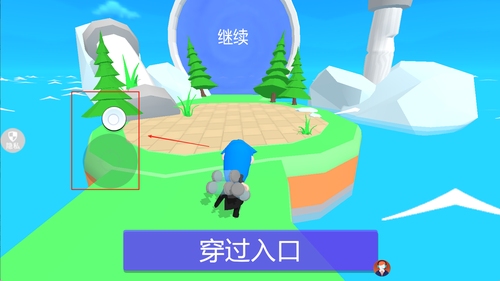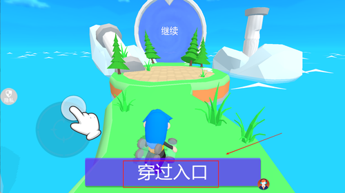 1、進(jìn)入游戲界面,點(diǎn)擊穿過入口按鈕,操控角色在小島場景移動,跟隨指引方向,前往帶有繼續(xù)標(biāo)識的區(qū)域。