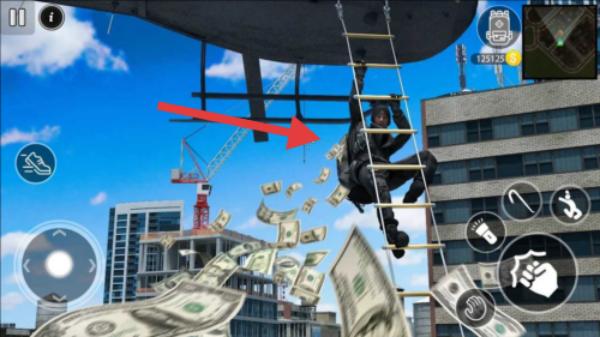 2、當(dāng)玩家遇到直升機(jī)撤離任務(wù),需要靠近爬梯,按提示互動(dòng)攀爬,途中收集金錢,注意避開(kāi)障礙物。