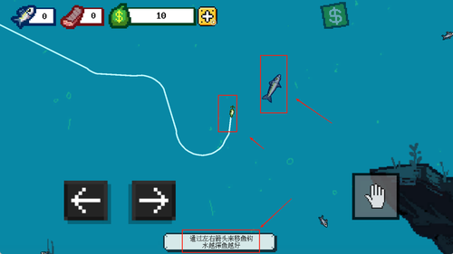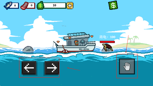 2、左側(cè)是控制船只移動(dòng)的按鈕,可調(diào)整位置尋找魚群,右側(cè)設(shè)有拋竿與收線功能鍵,界面下方會(huì)顯示魚竿狀態(tài)和當(dāng)前魚類掙扎力度,方便把控操作節(jié)奏。