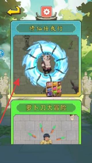 1、點(diǎn)擊【開(kāi)始游戲】進(jìn)入,在玩法選擇界面,選【修仙任我行】開(kāi)啟修仙冒險(xiǎn),操控豬形角色,在古建場(chǎng)景起步。