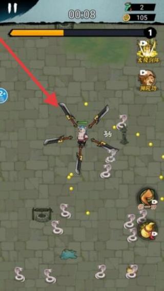 3、戰(zhàn)斗時(shí)控制角色如多刀環(huán)繞形態(tài),在石磚場(chǎng)地移動(dòng),躲避怪物,拾取金幣105,用技能太極劍陣攻擊,推進(jìn)關(guān)卡。