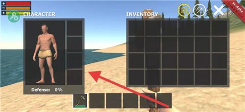 1、進入游戲,查看【CHARACTER】角色狀態(tài)防御0%和【INVENTORY】背包,熟悉界面,在海灘場景收集基礎(chǔ)資源如木材、石頭。
