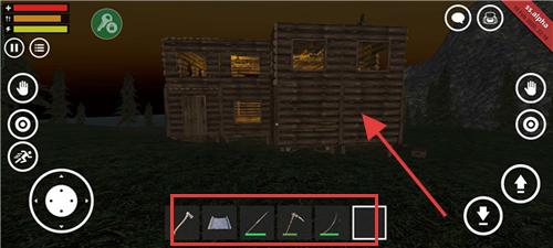 3、利用收集的資源,建造木屋如箭頭指向建筑,解鎖更多制作配方,夜晚前完成shelter,抵御危險,逐步發(fā)展生存設(shè)施。