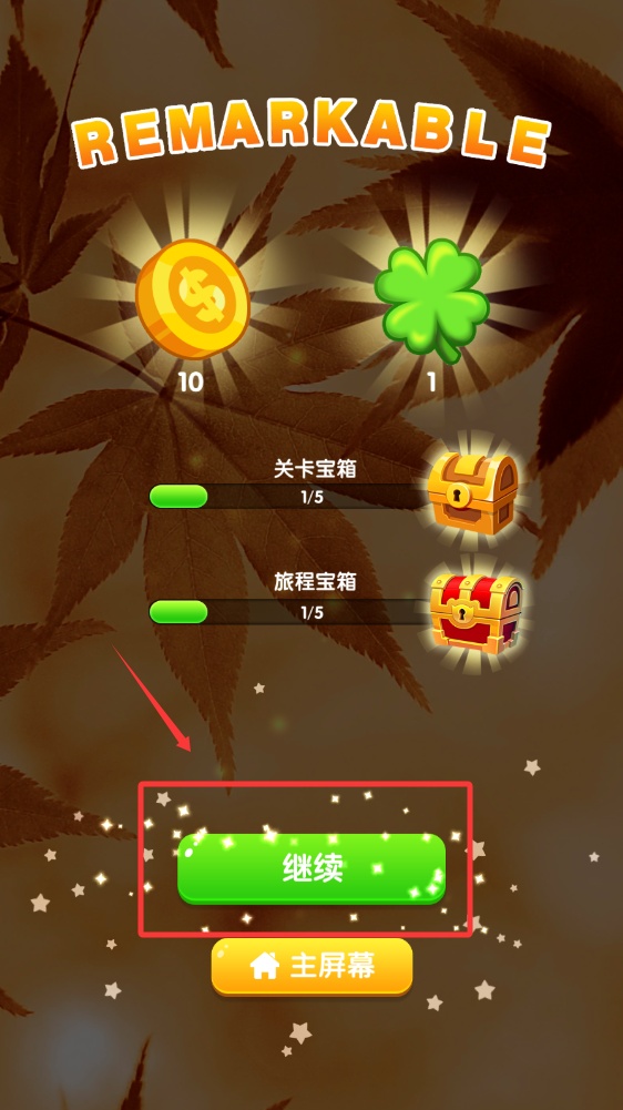 3、成功通關(guān)后,屏幕中央會(huì)彈出金色"繼續(xù)"按鈕,伴隨著慶祝動(dòng)畫(huà)和歡快的背景音樂(lè),點(diǎn)擊即可保存當(dāng)前進(jìn)度進(jìn)入后續(xù)關(guān)卡。
