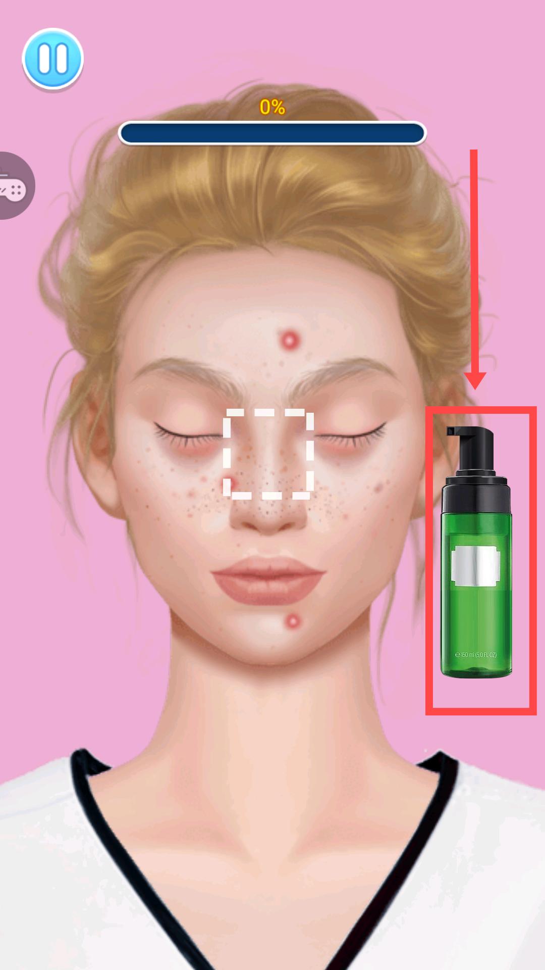 2、在美妝環(huán)節(jié),根據(jù)面部問題,點(diǎn)擊右側(cè)綠色潔面產(chǎn)品,將其作用于臉部清潔區(qū)域,去除肌膚雜質(zhì)。