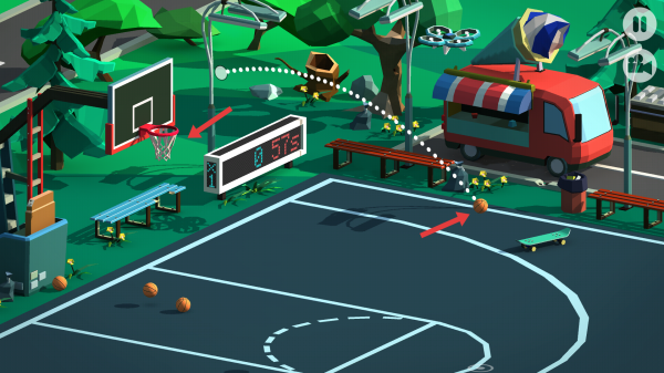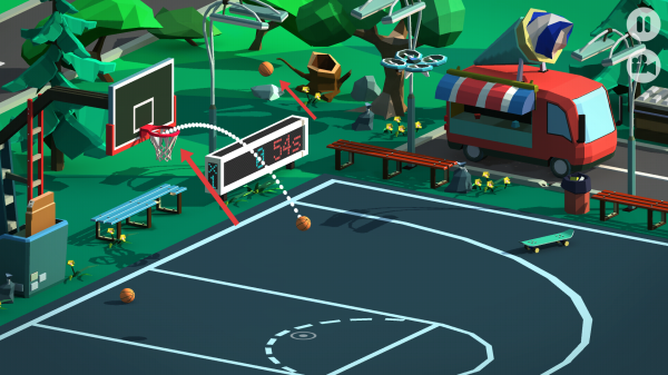 3、若籃球彈框反彈,緊盯落點(diǎn)再次拖曳瞄準(zhǔn),借助場地元素,如籃板邊緣補(bǔ)投,提升進(jìn)球率解鎖更多關(guān)卡。