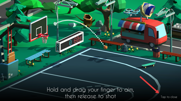 1、進(jìn)入戶外籃球場場景,按提示Hold and drag your finger to aim,長按屏幕拖曳調(diào)整投籃軌跡,對準(zhǔn)籃筐后釋放手指完成投籃。