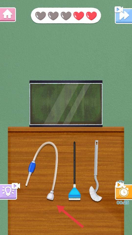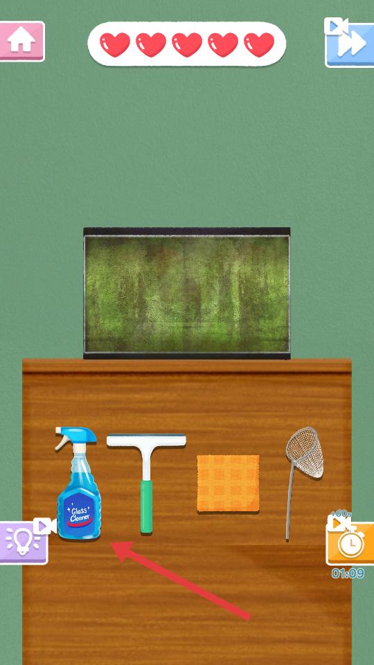 2、進(jìn)入首關(guān)卡,桌面陳列清潔工具,按照指引選取對應(yīng)工具,像藍(lán)色噴瓶,對魚缸及周邊展開清潔操作,逐步推進(jìn)任務(wù)進(jìn)度。