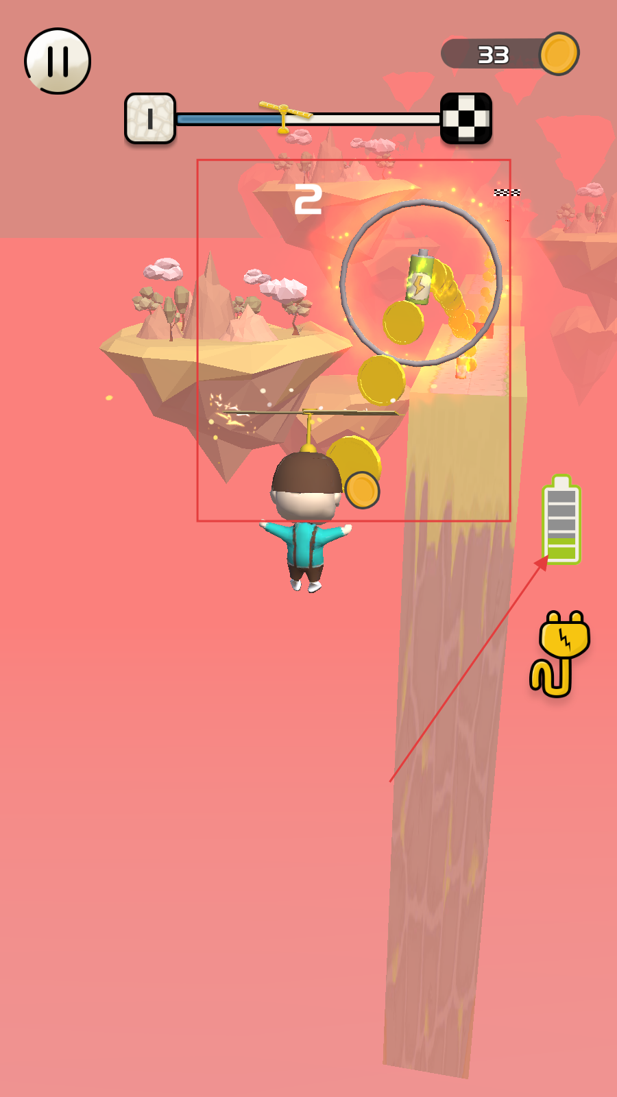 2、在游戲過(guò)程中長(zhǎng)按屏幕讓角色起飛,收集金幣和道具,注意電量的消耗。