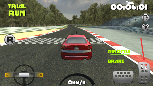 1、操控賽車時(shí),按下右側(cè)THROTTLE油門鍵加速,遇彎道提前按BRAKE剎車鍵減速,沿賽道白線指引穩(wěn)定起步推進(jìn)。