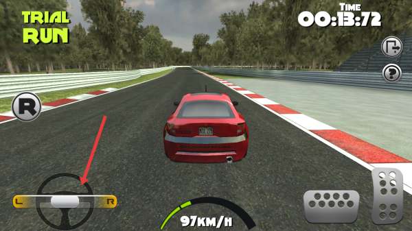 2、行駛中滑動(dòng)下方方向盤L/R調(diào)節(jié)轉(zhuǎn)向,保持賽車在賽道內(nèi),借油門維持速度,避開沖出跑道風(fēng)險(xiǎn)持續(xù)沖刺。