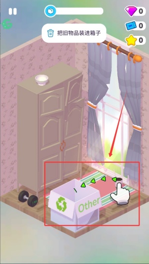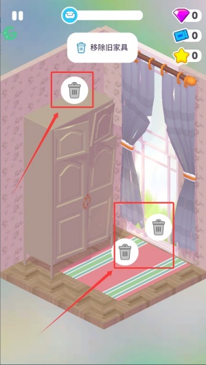 3、點(diǎn)擊并拖動(dòng)那些老舊的沉重家具,把褪色的布藝沙發(fā)、搖晃的木質(zhì)書柜等全部搬出房間,為后續(xù)裝修騰出充足空間。