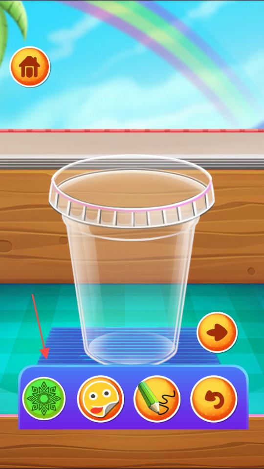 3、在制作場景中出現(xiàn)空杯子,點(diǎn)擊杯子下方藍(lán)色欄里的圖標(biāo),可選擇不同樣式裝飾杯子,為后續(xù)制作特色果汁做準(zhǔn)備。