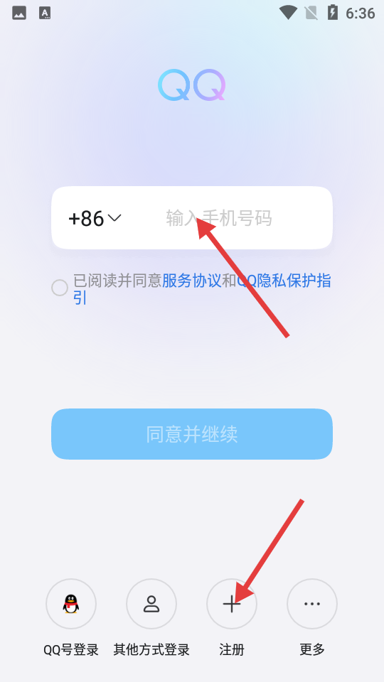 3、在注冊界面首先輸入手機(jī)號碼,然后點(diǎn)擊同意并繼續(xù)按鈕,接下來按照提示完成后續(xù)的注冊流程,即可完成2025qq手機(jī)版的注冊,開始使用qq的各項功能。
