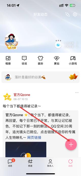 2、進(jìn)入好友動態(tài)頁面,能看到相冊、說說等功能按鈕,點(diǎn)擊右下角粉加號,彈出功能菜單。