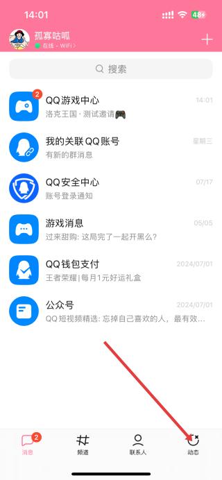 1、打開QQ,進(jìn)入消息頁面,能看到QQ游戲中心、我的關(guān)聯(lián)QQ賬號等各類消息入口,點(diǎn)擊右下角動態(tài)。
