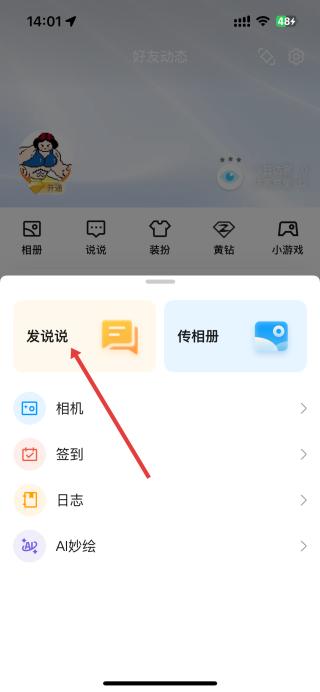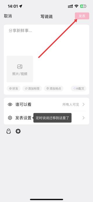 3、功能菜單中,點(diǎn)擊發(fā)說說,進(jìn)入寫說說頁面,可輸入想要分享的新鮮事,還能添加照片、視頻等。