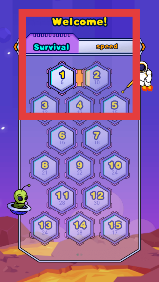 1、進(jìn)入生存模式,點(diǎn)擊關(guān)卡數(shù)字開始,用鉤子勾住彩色方塊,精準(zhǔn)放置到基座,堆疊成指定形狀通關(guān)。