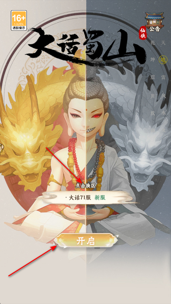 1、登錄界面點擊換區(qū),選定心儀服務器,確認后點擊開啟,踏入融合修仙與割草肉鴿玩法的大話蜀山開啟冒險。