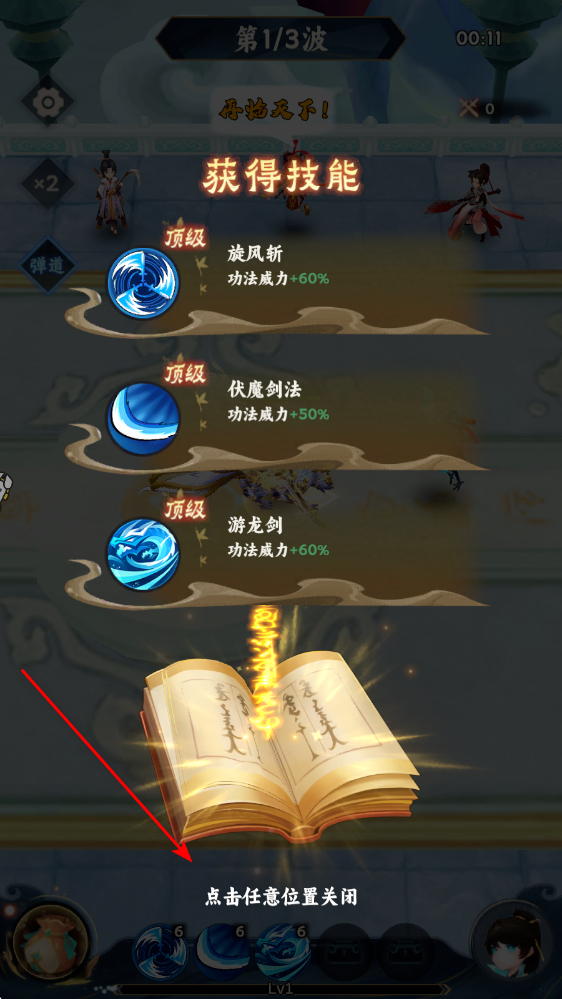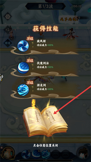 2、開啟寶箱后可獲得頂級技能,如旋風斬等,選擇技能后點擊任意位置關閉界面,繼續(xù)戰(zhàn)斗。