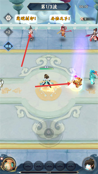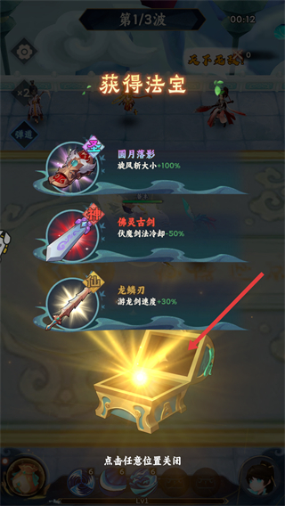 1、會出現寶箱,開啟寶箱可獲得技能或法寶,同時需應對一波波敵人,使用技能抵御進攻。