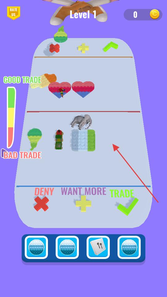 1、進(jìn)入物品交易游戲界面,查看底部物品欄道具,依據(jù)上方心形圖案評(píng)估交易價(jià)值,選對(duì)應(yīng)操作按鈕。
