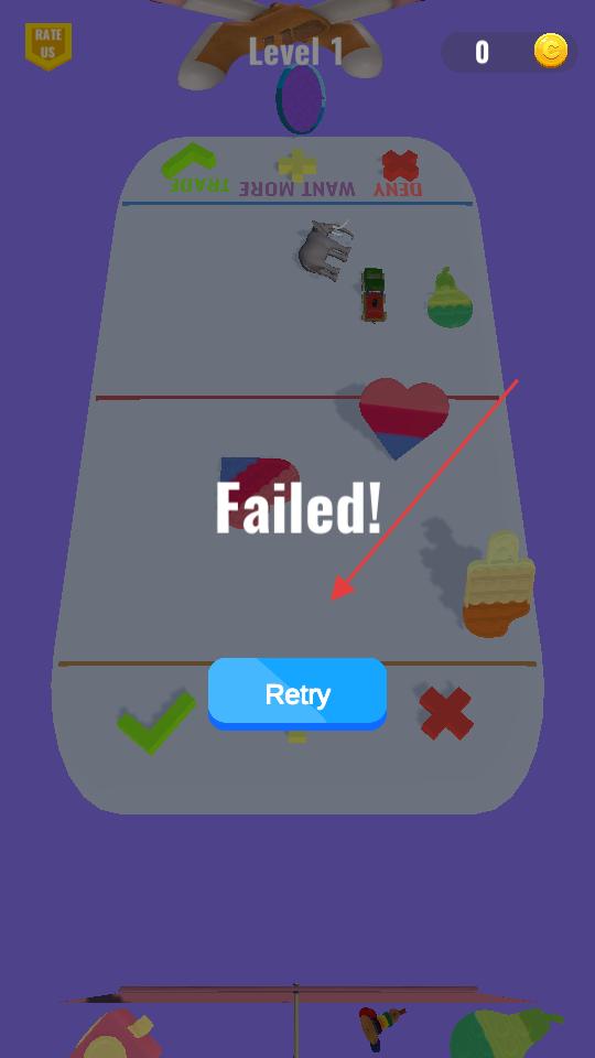 3、結(jié)束第一關(guān)卡,若交易失敗顯示Failed點(diǎn)擊Retry按鈕重新開(kāi)始,調(diào)整交易策略再次嘗試完成物品交換。