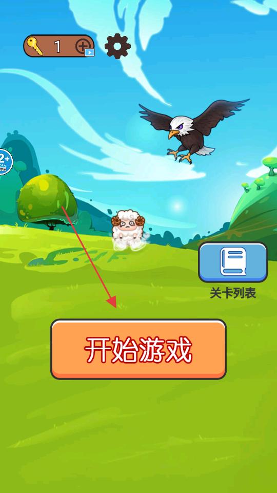 2、回到主場景,看到小羊和老鷹,點擊下方橙色開始游戲按鈕,進入關卡選擇或直接開啟第一關,正式開啟拯救小羊的冒險流程。