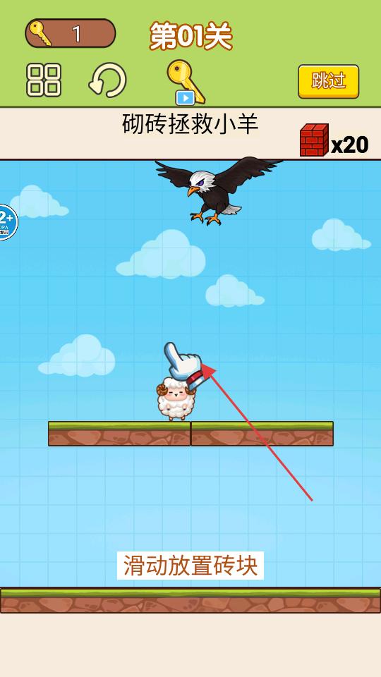3、進入第01關場景,根據(jù)提示滑動屏幕放置磚塊,在小羊上方或周圍合理鋪砌磚塊,阻擋老鷹襲擊,保護小羊安全通過關卡。