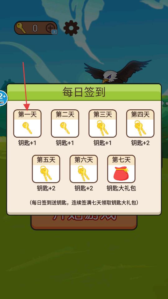 1、進入游戲界面,找到每日簽到彈窗,點擊紅色箭頭指向的第一天區(qū)域,完成簽到獲取鑰匙,簽到后彈窗消失,可進行后續(xù)游戲操作。