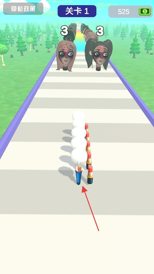 2、在關(guān)卡1跑道,引導(dǎo)美妝工具收集同類道具,合并升級(jí),應(yīng)對(duì)前方障礙與目標(biāo),按箭頭指引方向移動(dòng)。