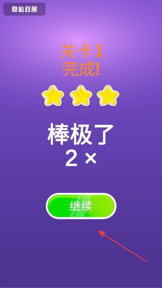 3、成功完成關(guān)卡1,界面顯示關(guān)卡完成及繼續(xù)按鈕,點(diǎn)擊綠色繼續(xù),進(jìn)入下一關(guān),繼續(xù)美妝跑酷挑戰(zhàn)進(jìn)程。