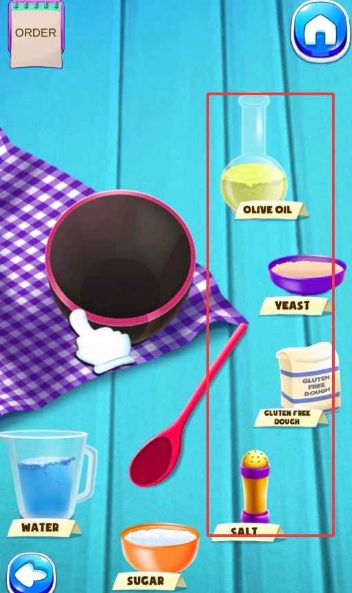 2、一進(jìn)游戲就能看見各種材料擺滿桌,面粉、雞蛋、奶油啥都有,想用哪個(gè)拿哪個(gè)。