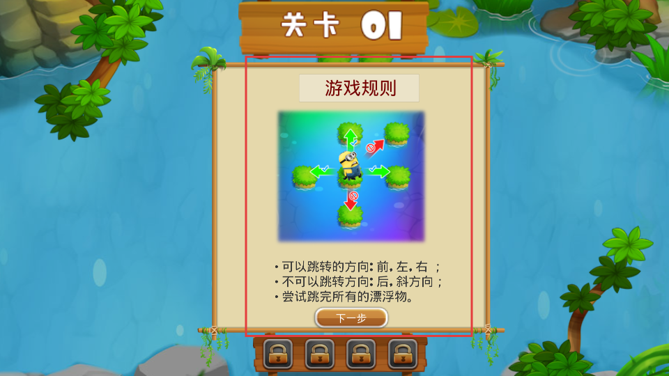 1、依據(jù)規(guī)則,操控小黃人只能向前、左、右方向跳轉(zhuǎn),避開后和斜向,規(guī)劃路徑跳完所有漂浮物,完成關(guān)卡挑戰(zhàn)。