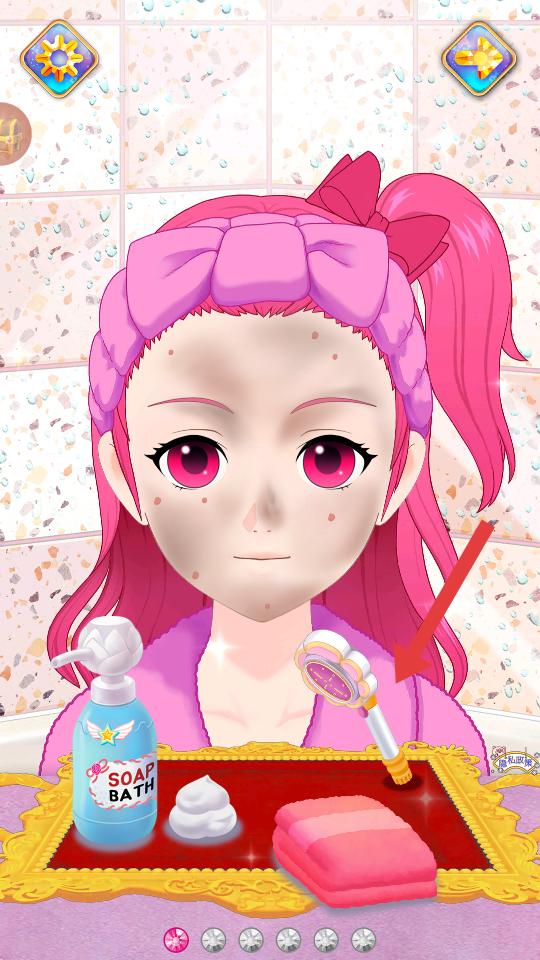 3、進(jìn)入面部護(hù)理場(chǎng)景,角色頭戴粉色發(fā)帶,根據(jù)箭頭指引,點(diǎn)擊對(duì)應(yīng)美容工具,使用道具對(duì)角色面部進(jìn)行清潔、護(hù)理操作,改善面部狀態(tài)。