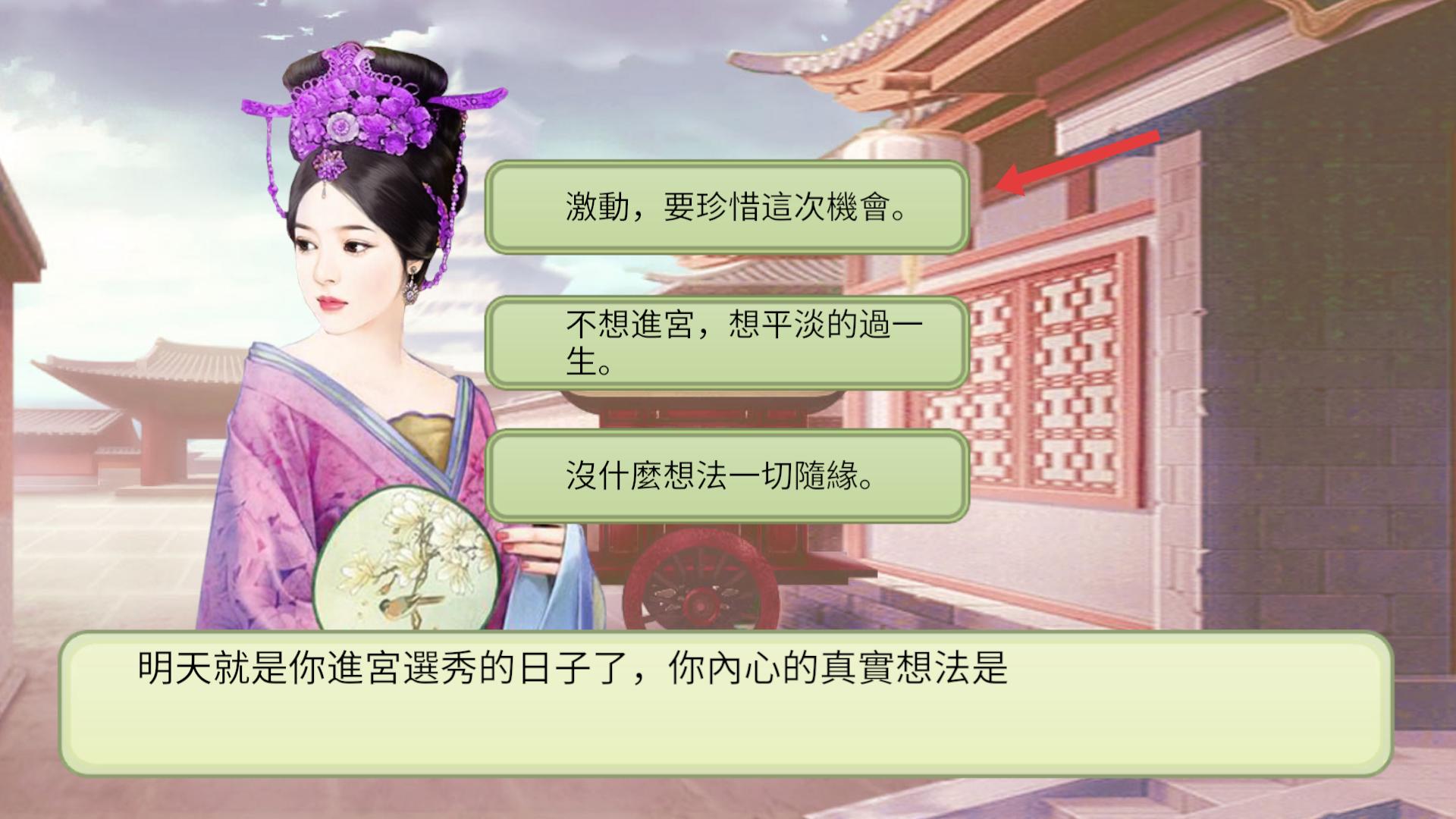 1、選秀前面對進宮抉擇,從激動珍惜機會、不想進宮求平淡、一切隨緣里選一種,不同選擇會讓后續(xù)初始劇情朝不同方向發(fā)展。