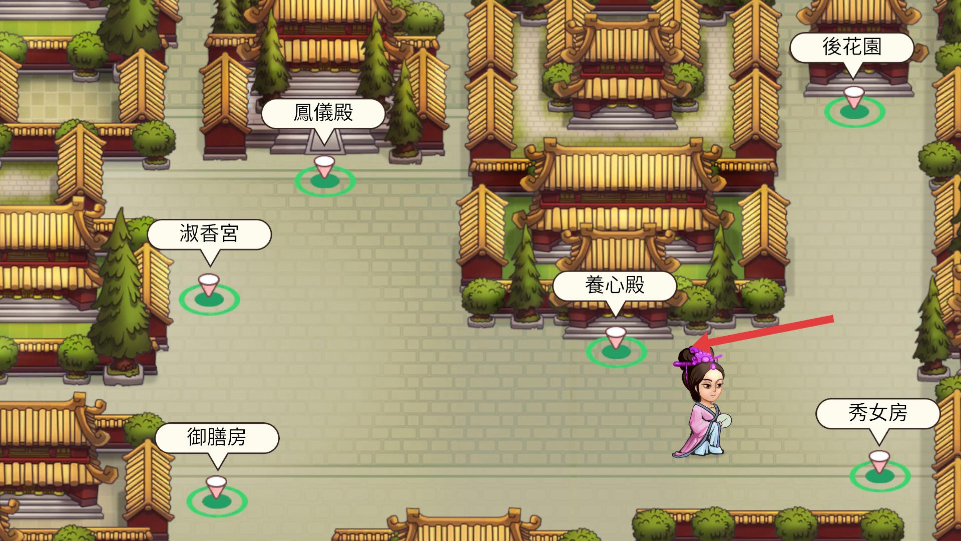 2、進入宮廷地圖后,操控角色前往鳳儀殿、養(yǎng)心殿等不同宮殿,在各場景觸發(fā)事件,和宮內(nèi)人物交流互動,積累資源或提升好感。