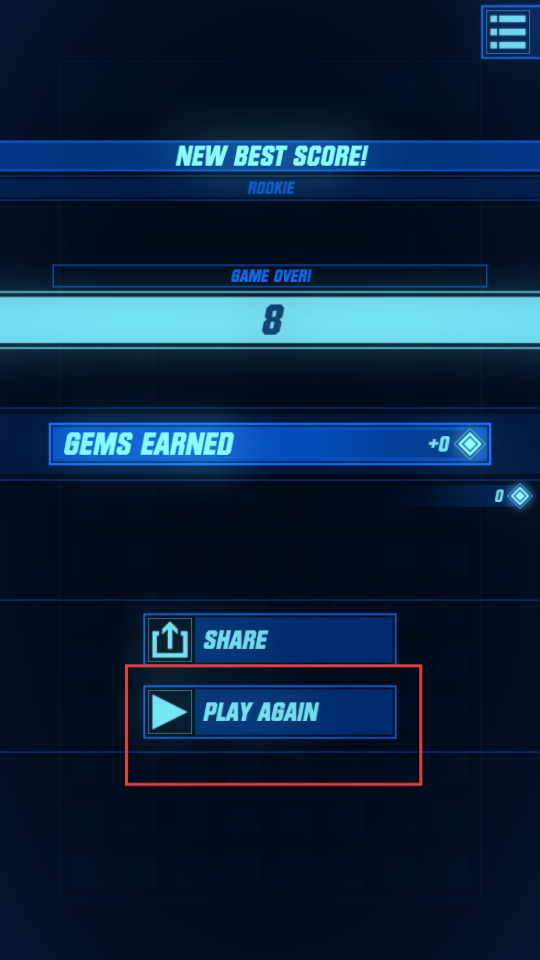 3、每局結(jié)束看分數(shù)和排名,若想再玩,點擊PLAY AGAIN按鈕,重新開始新一局,嘗試突破之前分數(shù),挑戰(zhàn)更高紀錄。