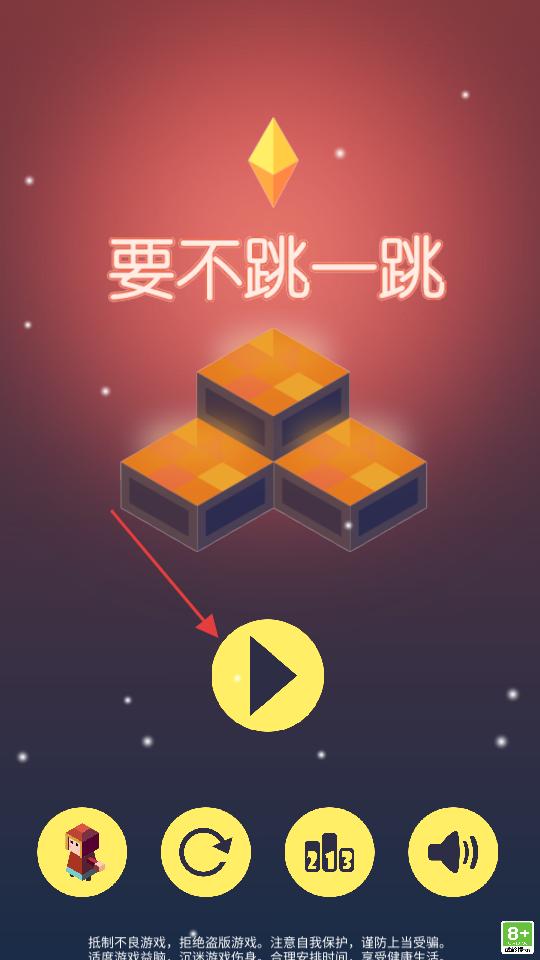 1、進(jìn)入要不跳一跳啟動界面,畫面呈現(xiàn)立體方塊與佳作名,點(diǎn)擊三角形按鈕,開始游戲,進(jìn)入跳躍挑戰(zhàn)環(huán)節(jié)。