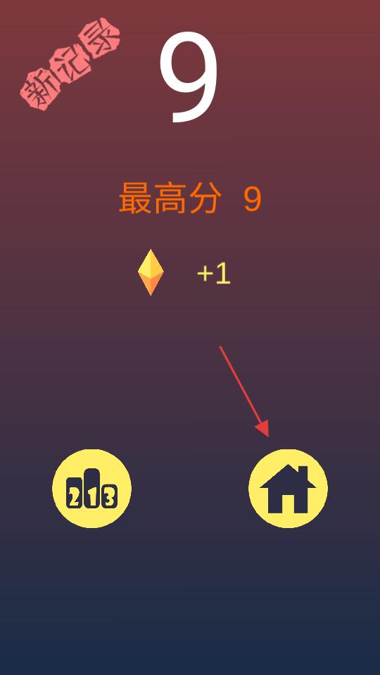 3、游戲結(jié)束后,進(jìn)入要不跳一跳結(jié)算界面,顯示新記錄、最高分9及獲得1個菱形道具,點(diǎn)擊房子圖標(biāo)按鈕,返回游戲主頁。