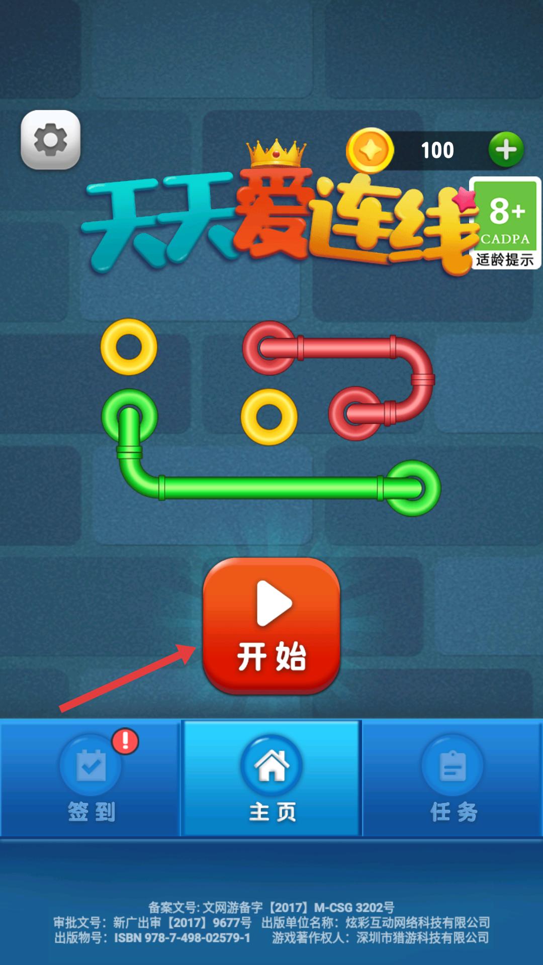 1、點(diǎn)擊開(kāi)始進(jìn)入天天愛(ài)連線,挑戰(zhàn)管道連線關(guān)卡,合理規(guī)劃路徑,連接同色圓環(huán),完成任務(wù)。