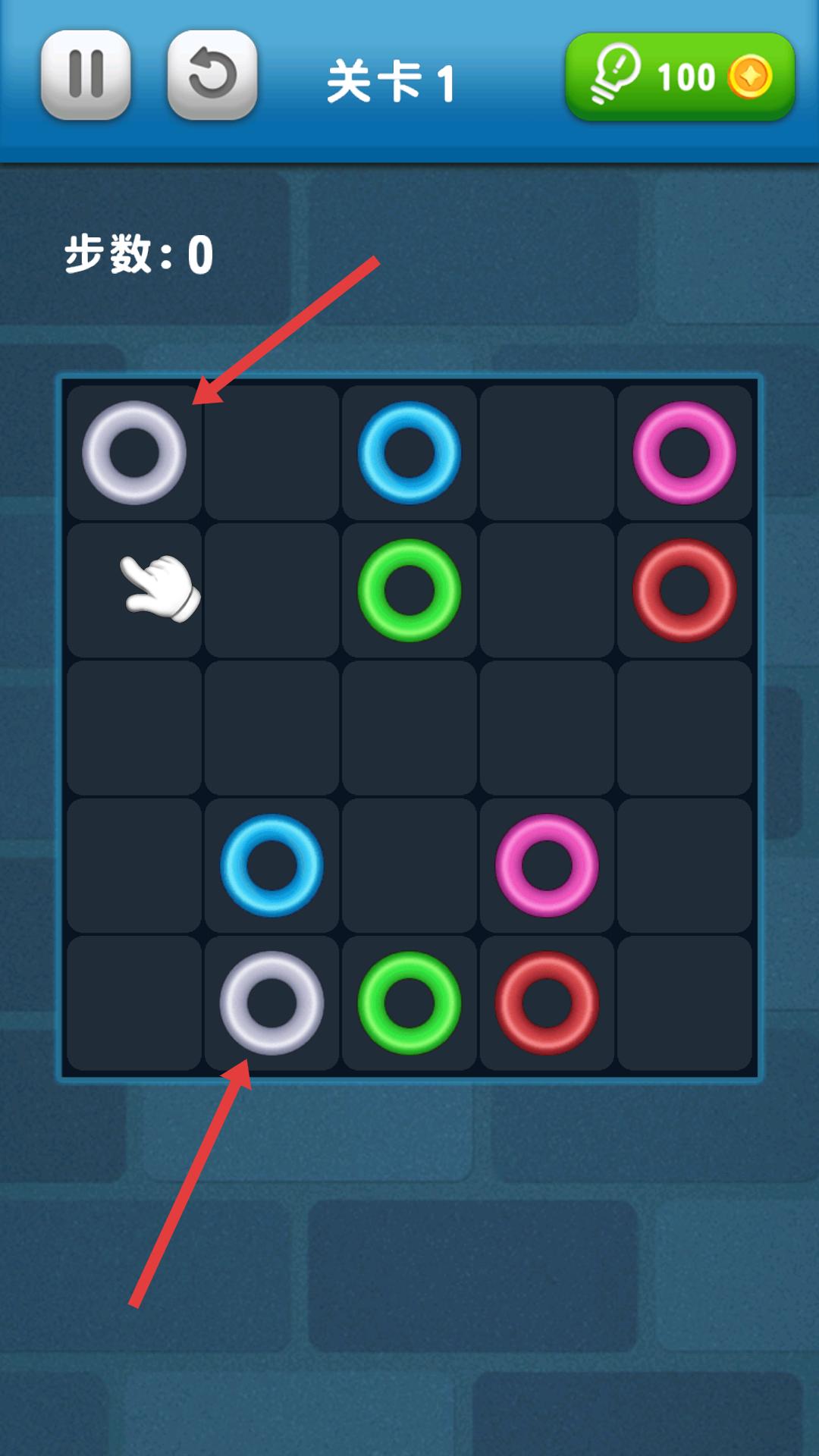 2、關(guān)卡1中按指引拖動(dòng)同色圓環(huán),沿網(wǎng)格連線,注意路徑不交叉,逐步連接所有同色圓環(huán)。