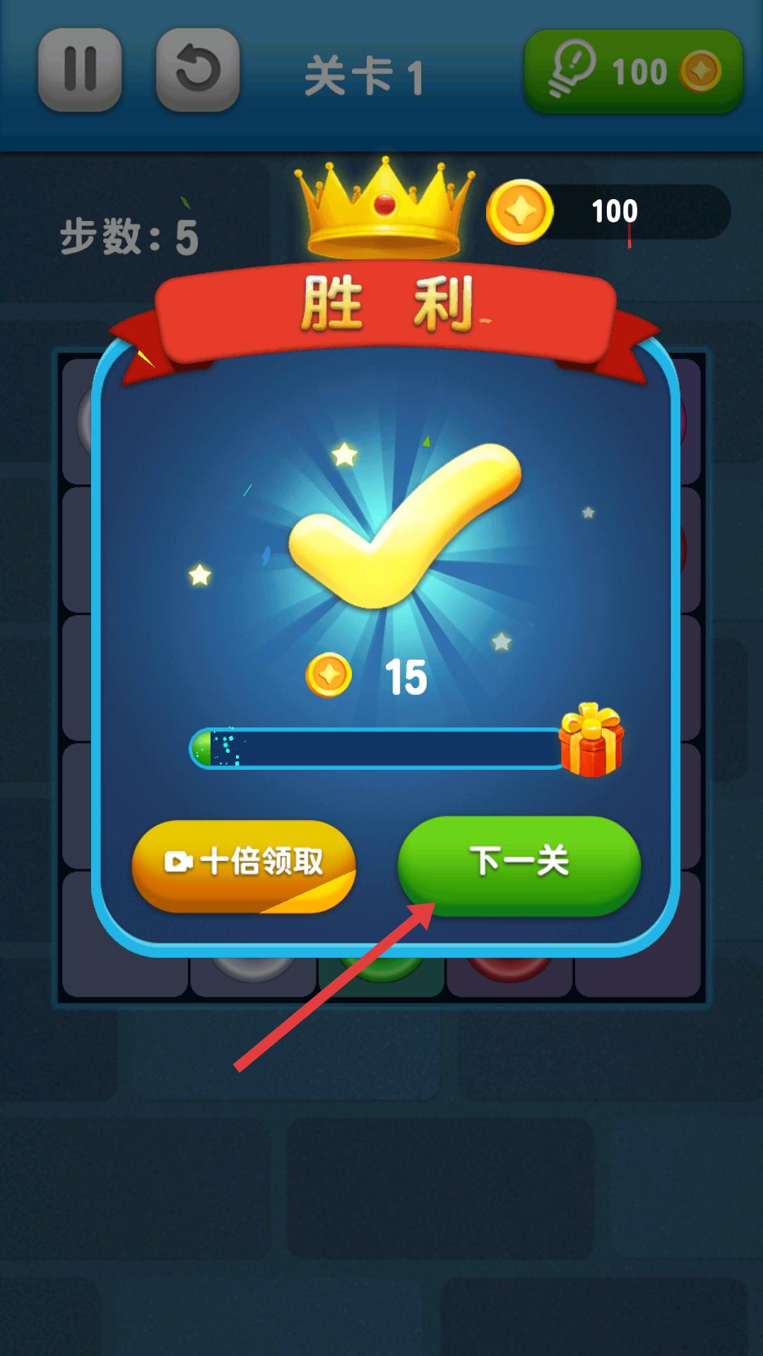 3、成功通關(guān)后,點(diǎn)擊下一關(guān),繼續(xù)挑戰(zhàn)更難關(guān)卡,積累金幣,解鎖新玩法,提升連線技巧。