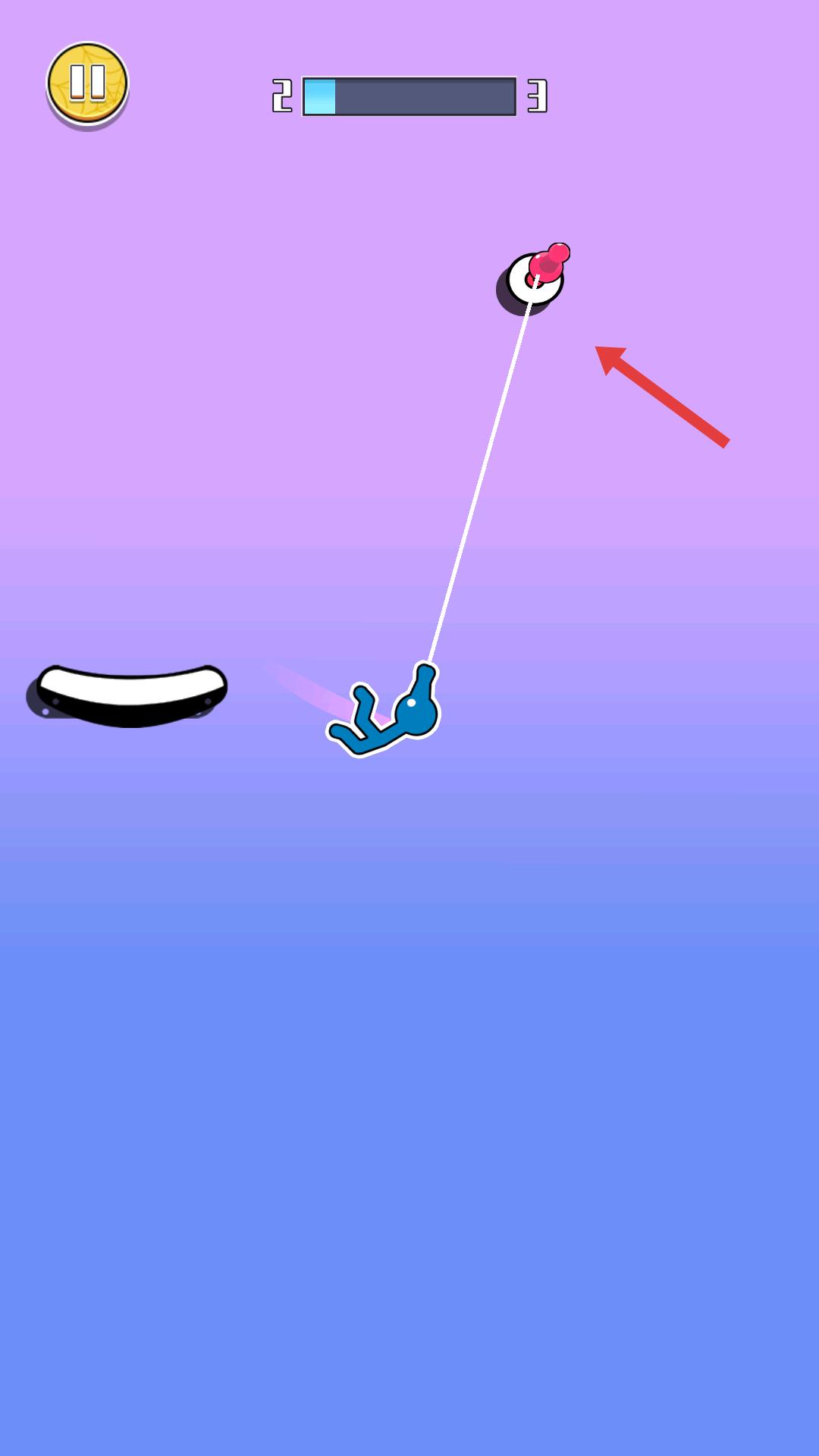 3、操控藍(lán)色小人,借助繩索的牽引,在空中移動(dòng),朝著目標(biāo)方向前進(jìn),完成關(guān)卡中的移動(dòng)任務(wù)。