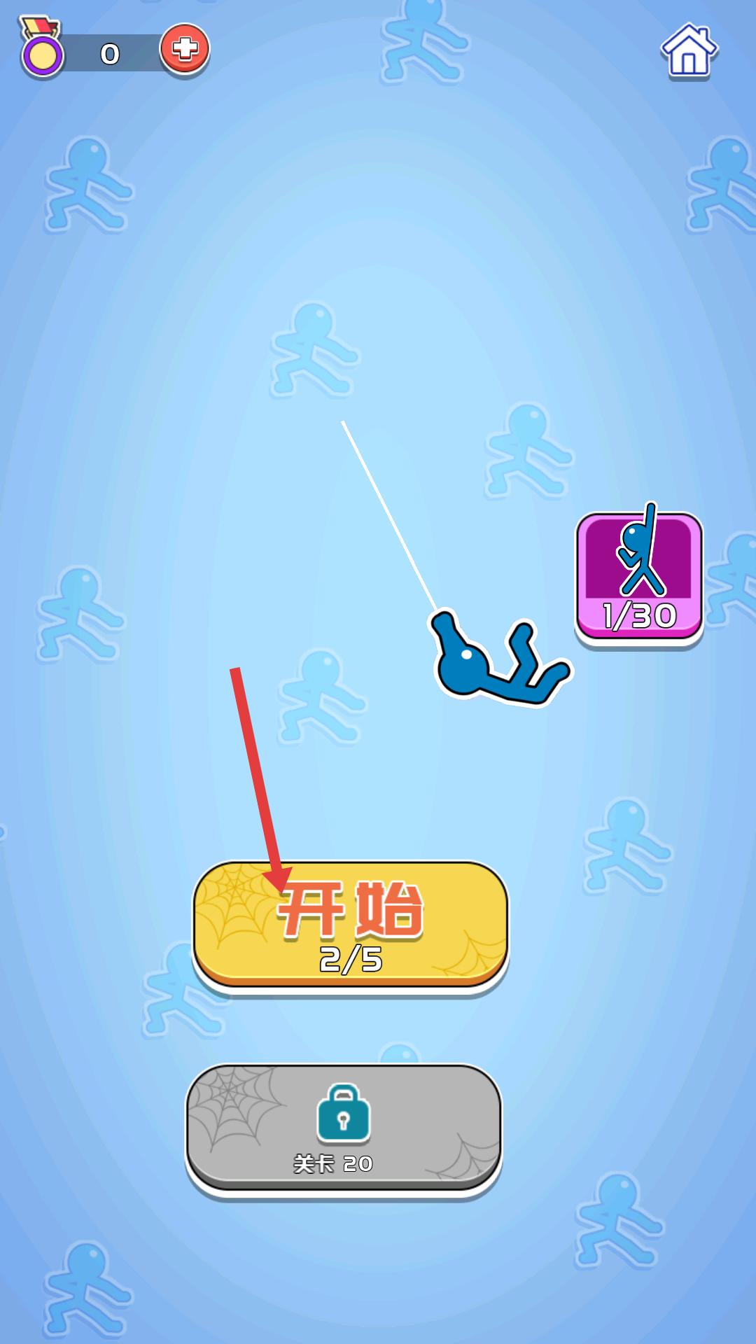 1、點(diǎn)擊【開始】按鈕,進(jìn)入關(guān)卡,準(zhǔn)備操控藍(lán)色小人,利用繩索等機(jī)制開始冒險(xiǎn),開啟本關(guān)的挑戰(zhàn)之旅。