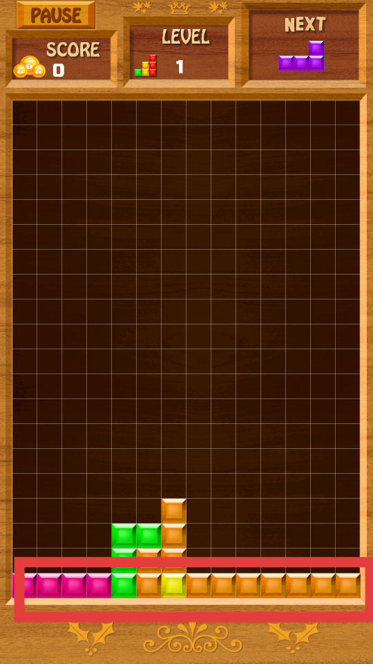 3、當(dāng)玩家將一行方塊被填滿時(shí),這一行會(huì)被消除,玩家獲得相應(yīng)分?jǐn)?shù),隨著游戲進(jìn)行方塊下落速度可能會(huì)加快,難度增加當(dāng)方塊堆積到頂部,無(wú)法再進(jìn)行放置時(shí)游戲結(jié)束。
